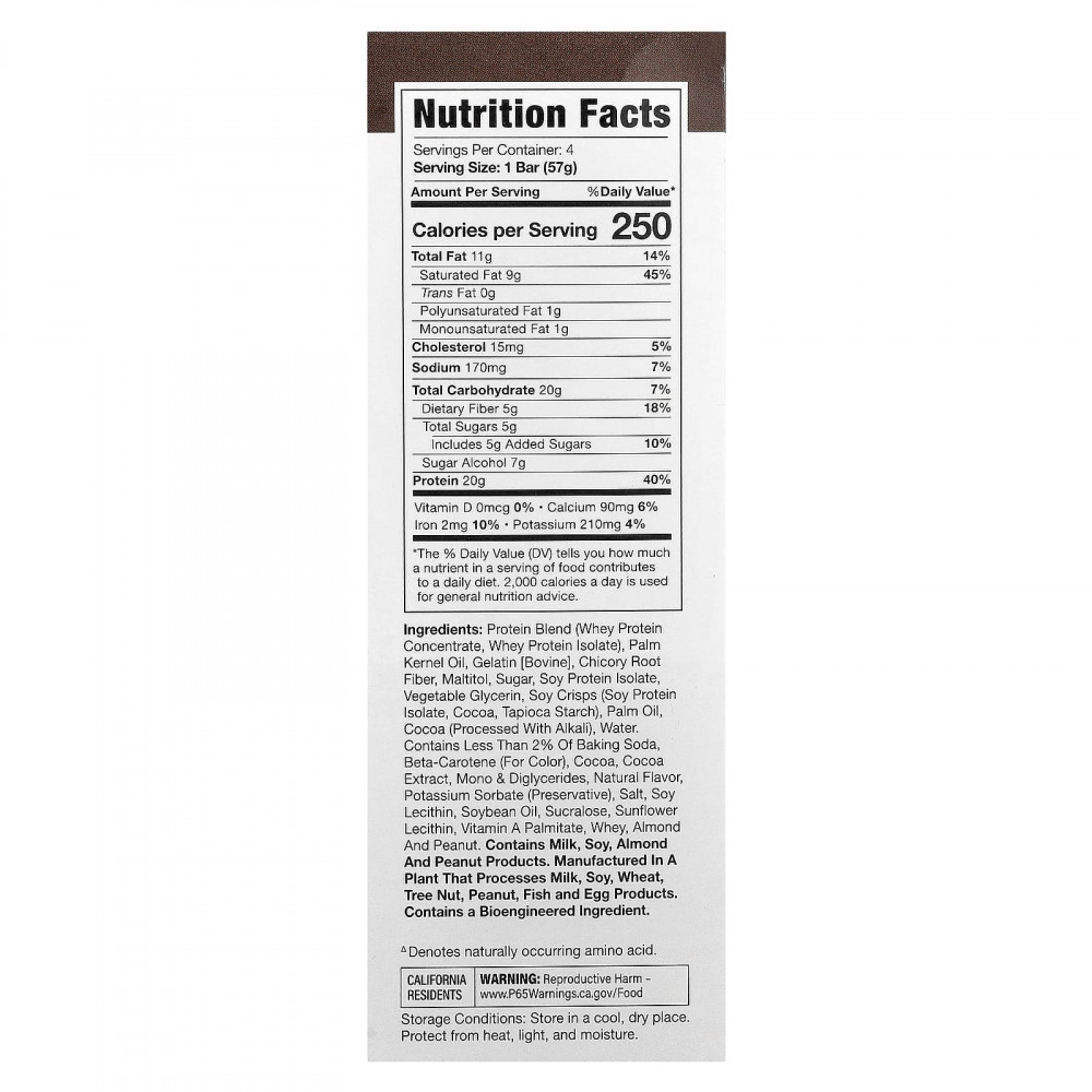 Протеиновая смесь (концентрат сывороточного протеина, изолят сывороточного протеина), пальмоядровое масло, желатин [бычий], клетчатка из корня цикория, мальтит, сахар, изолят соевого белка, растительный глицерин, соевые чипсы (изолят соевого протеина, какао, тапиоковый крахмал), пальмовое масло, какао (обработанное щёлочью), вода. Содержит менее 2% пищевой соды., бета-каротин (краситель), какао, экстракт какао, моно- и диглицериды, натуральный ароматизатор, сорбат калия (консервант), соль, соевый лецитин, соевое масло, сукралоза, подсолнечный лецитин, витамин A (пальмитат), сыворотка, миндаль и арахис.
