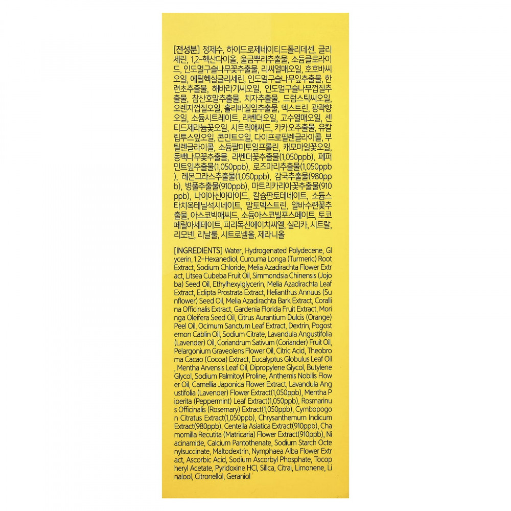 Вода, гидрогенизированный полидецен, глицерин, 1,2-гександиол, экстракт корня куркумы (Curcuma longa), хлорид натрия, экстракт цветков дерева ним (Melia azadirachta), масло плодов лицеи кубебы (Litsea cubeba), масло из семян жожоба (Simmondsia chinensis), этилгексилглицерин, экстракт листьев дерева ним (Melia azadirachta), экстракт эклипты простёртой (Eclipta prostrata), подсолнечное масло (Helianthus annuus), экстракт коры дерева ним (Melia azadirachta), экстракт кораллины лекарственной (Corallina officinalis), экстракт плодов гардении жасминовидной (Gardenia florida), масло из семян моринги масличной (Moringa oleifera), масло из цедры апельсина (Citrus aurantium dulcis), экстракт листьев туласи (Ocimum sanctum), декстрин, масло пачули (Pogostemon cablin), цитрат натрия, лавандовое масло (Lavandula angustifolia), масло из плодов кориандра (Coriandrum sativum), масло из цветков герани (Pelargonium graveolens), лимонная кислота, экстракт какао (Theobroma cacao), масло из листьев эвкалипта (Eucalyptus globulus) и масло из листьев мяты полевой (Mentha arvensis), дипропиленгликоль, бутиленгликоль, пальмитоил пролин натрия, масло цветков ромашки английской (Anthemis nobilis), экстракт цветков камелии японской (Camellia japonica), экстракт цветков лаванды (Lavandula angustifolia) (1050 част./млрд), экстракт листьев перечной мяты (Mentha piperita) (1050 част./млрд), экстракт розмарина (Rosmarinus officinalis) (1050 част./млрд), экстракт лемонграсса (Cymbopogon citratus) (1050 част./млрд), экстракт хризантемы (Chrysanthemum indicum) (980 част./млрд), экстракт готу колы (Centella asiatica) (910 част./млрд), экстракт цветков ромашки (Chamomilla recutita) (910 част./млрд), никотинамид, пантотенат кальция, натрия крахмал октенилсукцинат, мальтодекстрин, экстракт цветков кувшинки белой (Nymphaea alba), аскорбиновая кислота, аскорбил фосфат натрия, токоферилацетат, пиридоксина гидрохлорид, диоксид кремния, цитраль, лимонен, линалоол, цитронеллола, гераниол.