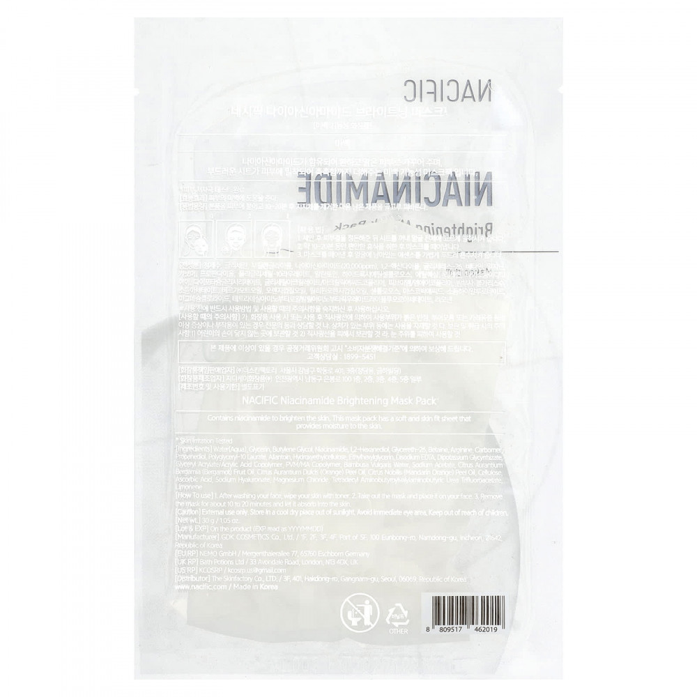 Содержит никотинамид, который осветляет кожу. Эта упаковка-маска содержит мягкое и обволакивающее полотно, которое увлажняет кожу.