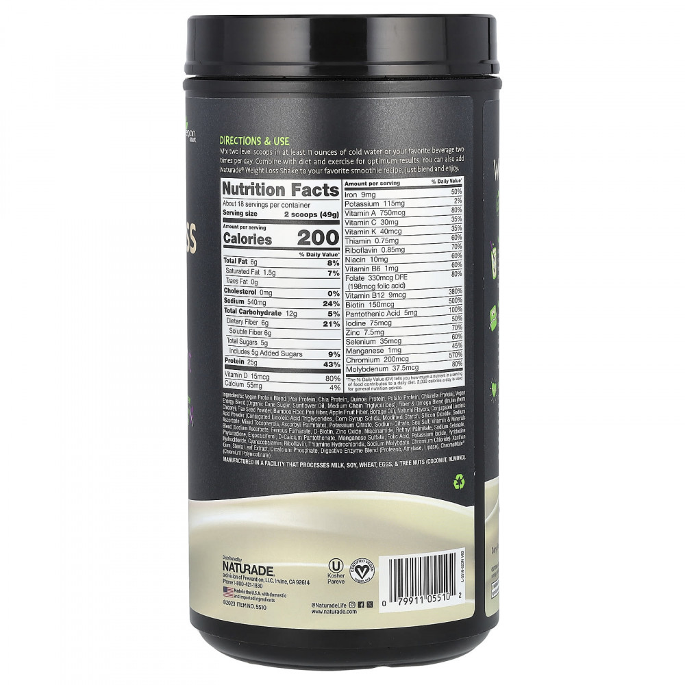 Веганская протеиновая смесь (гороховый протеин, белок чиа, белок киноа, картофельный белок, хлорелла), веганская энергетическая смесь (органический тростниковый сахар, подсолнечное масло, среднецепочечные триглицериды), клетчатка и волокно смесь омега (инулин (из цикория), порошок из семян льна, бамбуковое волокно, гороховая клетчатка, клетчатка из плодов яблока, масло бурачника), натуральные ароматизаторы, порошок конъюгированной линолевой кислоты (триглицериды конъюгированной линолевой кислоты, сухая кукурузная патока, модифицированный крахмал, диоксид кремния, аскорбат натрия, смешанные токоферолы, аскорбил пальмитат), цитрат калия, цитрат натрия, морская соль, витамин & amp; смесь минералов (аскорбат натрия, фумарат железа, d-биотин, оксид цинка, никотинамид, ретинилпальмитат, селенат натрия, фитонадион, эргокальциферол, d-пантотенат кальция, сульфат марганца, фолиевая кислота, йодид калия, пиридоксина гидрохлорид, цианокобаламин, рибофлавин, тиамина гидрохлорид, молибдат натрия, хлорид хрома), ксантановая камедь, экстракт листьев стевии, дикальций фосфат, смесь пищеварительных ферментов (протеаза, амилаза, липаза), ChromeMate® (полиникотинат хрома).