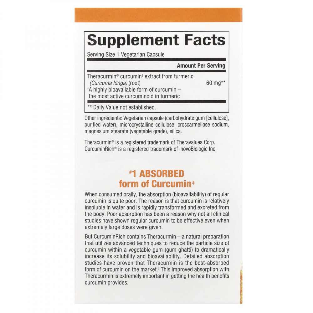 При производстве натурального препарата Theracurmin, который содержится в составе CurcuminRich, используются передовые методы уменьшения размера частиц куркумина в растительной камеди (камедь гхатти), что значительно увеличивает его растворимость и биодоступность. Подробные исследования усвояемости доказали, что Theracurmin является самой лучшей по усвояемости формой куркумина на рынке‡. Улучшенная усвояемость за счет Theracurmin чрезвычайно важна для получения организмом всех полезных свойств куркумина.