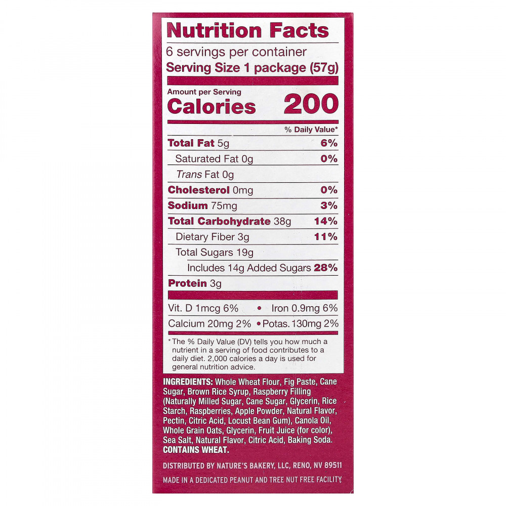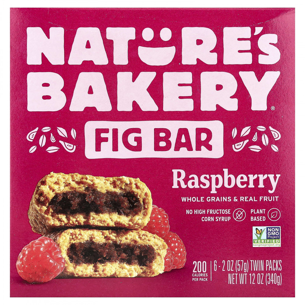 Цельнозерновая пшеничная мука, инжирная паста, тростниковый сахар, сироп из бурого риса, малиновая начинка (натуральный измельченный сахар, тростниковый сахар, глицерин, рисовый крахмал, малина, порошок из яблока, натуральный ароматизатор, пектин, лимонная кислота, камедь рожкового дерева), рапсовое масло, цельнозерновой овес, глицерин, свекольный сок (краситель), морская соль, натуральный ароматизатор, лимонная кислота, пищевая сода.