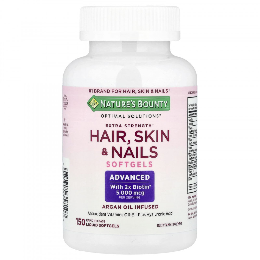 Здоровье — это всегда красиво. Формула Optimal Solutions® от компании Nature's Bounty® с повышенной силой действия† для здоровья волос, кожи и ногтей с аргановым маслом поможет вам выглядеть и чувствовать себя великолепно! Средство содержит сбалансированный комплекс питательных веществ для красивых волос, здоровых ногтей и сияющей кожи.