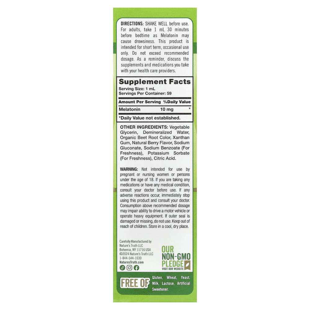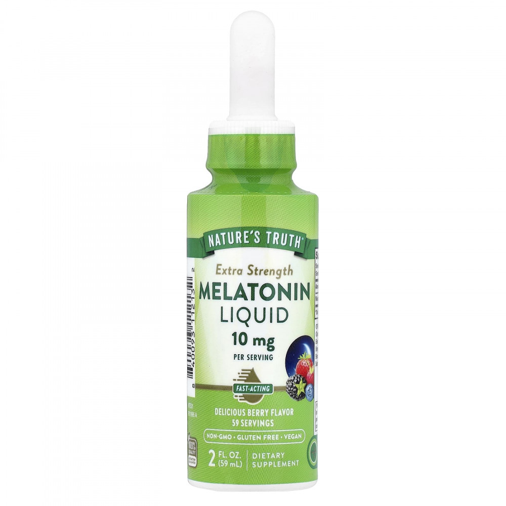 Почувствуйте всю силу мелатонина с повышенной силой действия от Nature's Truth® в жидкой форме+. Мелатонин — это гормон, который естественным образом вырабатывается шишковидной железой и является неотъемлемой частью цикла сна и бодрствования в организме. Наша формула содержит дозу 10 мг этого природного гормона повышенной силы действия в быстродействующей и удобной жидкости.