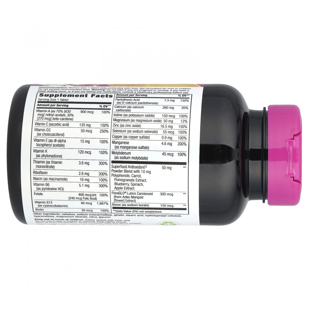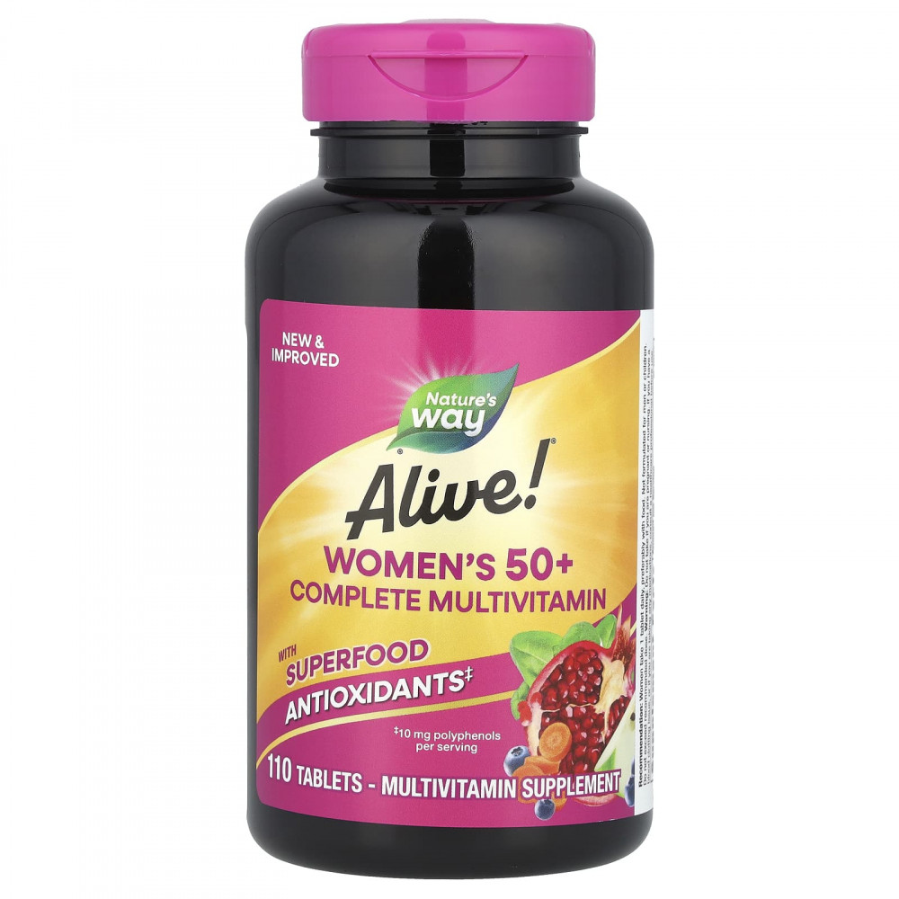 С возрастом потребности в питании меняются. Мультивитамины для женщин старше 50 лет Alive! разработаны, чтобы помочь вам чувствовать себя хорошо после 50 лет. Они содержат не менее 100% суточной нормы 19 витаминов и минералов, а также высокоэффективные витамины группы B, которые помогают преобразовывать пищу в клеточную энергию, чтобы вы могли жить полной жизнью каждый день. Эти мультивитамины для ежедневного приёма поддерживает здоровье кожи, глаз, костей, сердца, клеточной энергии и иммунитета. Содержит порошковую смесь антиоксидантов-суперфудов с 10 мг полифенолов в каждой порции, включая гранат, шпинат и голубику.