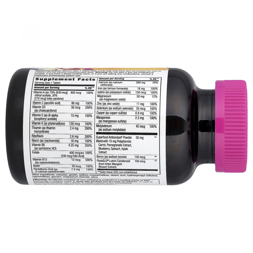 Избавьтесь от напряженных будней и насладитесь блаженными моментами с Alive! Полный мультивитаминный комплекс для женщин. Этот высокоэффективный мультивитаминный комплекс содержит 100% суточной нормы 20 незаменимых витаминов и минералов, включая бор и лютеин*. Кроме того, он содержит высокоэффективные витамины группы B для ежедневной поддержки клеточного уровня энергии. Удостоверяйтесь, что вы получаете самые лучшие ингредиенты, даже когда жизнь становится сумасшествием. Содержит порошковую смесь антиоксидантов-суперфудов с 10 мг полифенолов в каждой порции, включая гранат, шпинат и голубику.