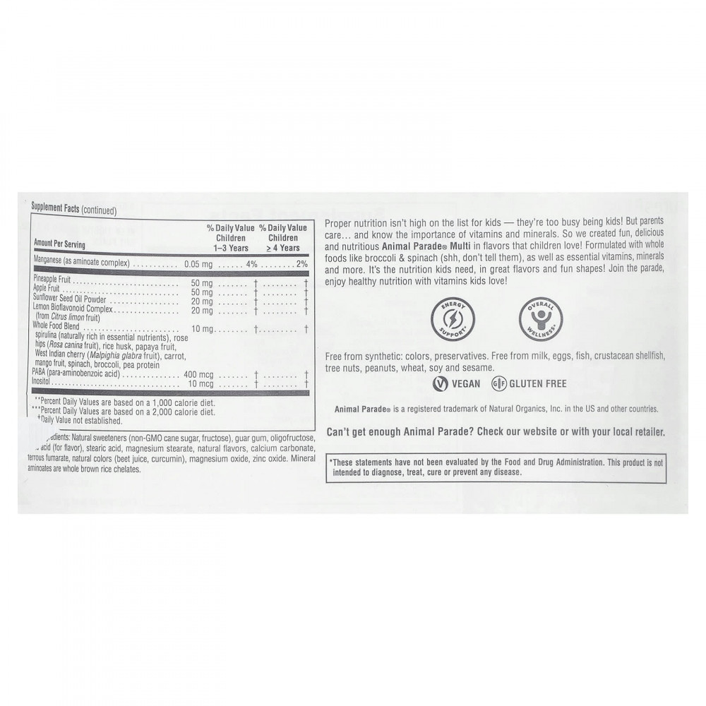 Дети не заботятся о правильном питании — они слишком заняты своими детскими делами. Но родители заботятся и знают о важности витаминов и минералов. Поэтому мы создали веселую, вкусную и питательную мультивитаминную добавку Animal Parade® с вкусом, который нравится детям! В ее состав входят цельные продукты, такие как брокколи и шпинат (только не рассказывайте им), а также необходимые витамины, минералы и многое другое. Это необходимое детям питание с отличным вкусом и в забавной форме! Присоединяйтесь к параду, наслаждайтесь здоровым питанием с витаминами, которые любят дети!