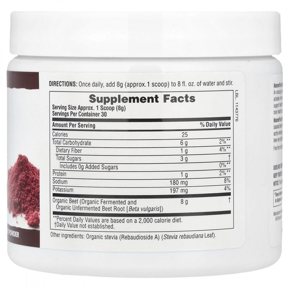 Порошок из органической свёклы от NaturesPlus имеет впечатляющий размер порции 8 г (30 порций в упаковке) и содержит сбалансированную смесь ферментированного органического и неферментированного органического порошка из свёклы. И хотя многим нравится натуральный и насыщенный вкус свёклы, для тех, кому этот вкус не по душе, мы добавили натуральную стевию для придания лёгкой сладости. Вкус оценят все! Жизнь прекрасна!