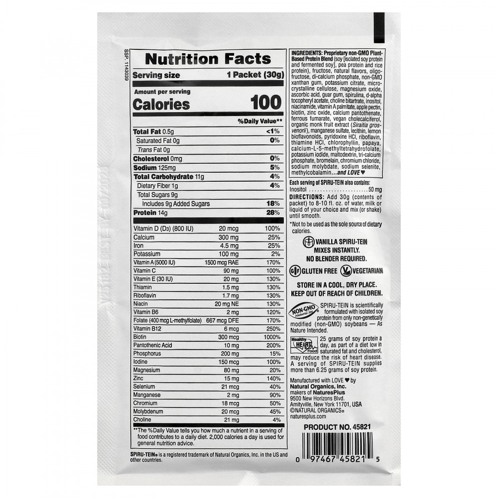 Каждая порция Spiru-Tein также содержит 50 мг инозитола.