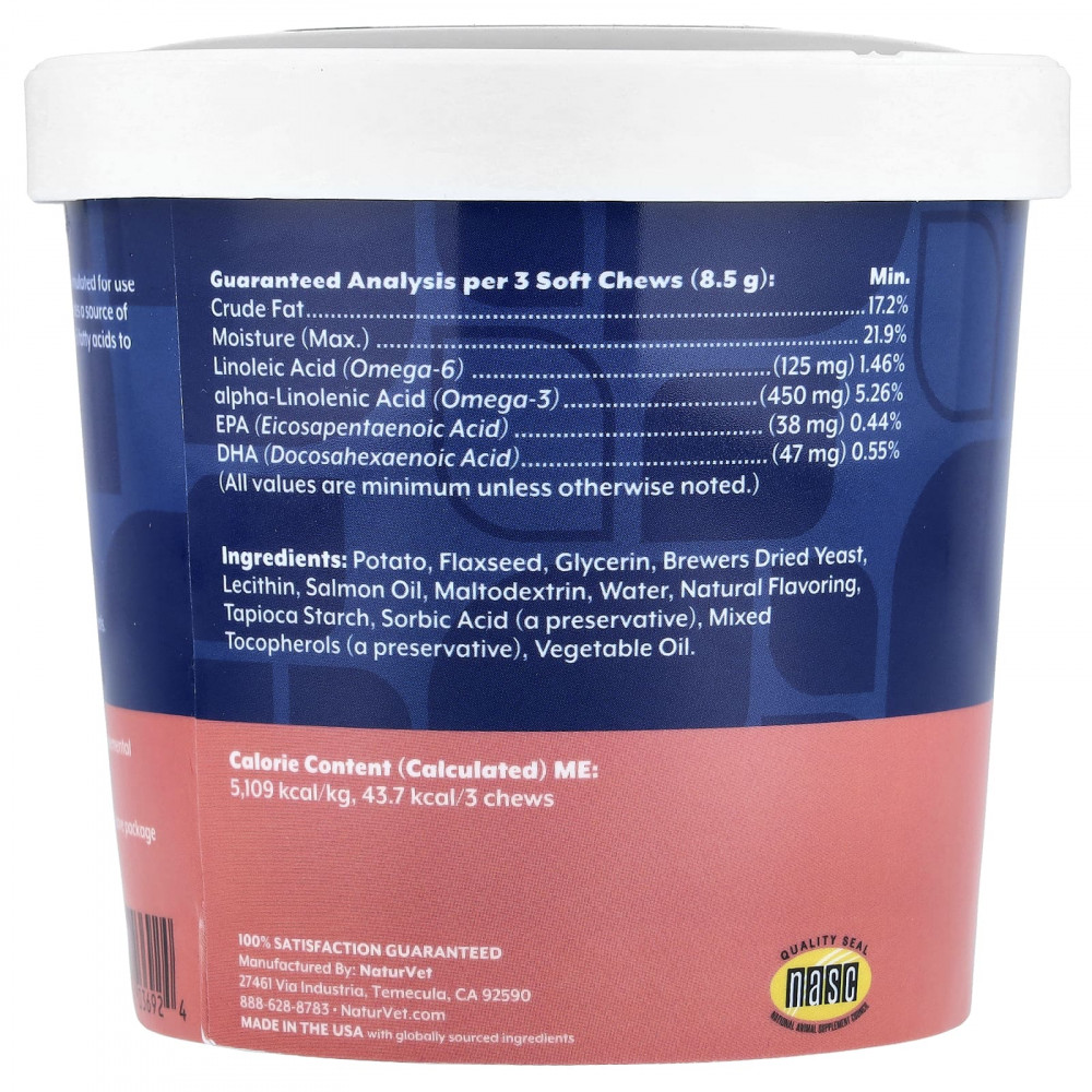 картофель, льняное семя, глицерин, сухие пивные дрожжи, лецитин, жир лосося, мальтодекстрин, вода, натуральный ароматизатор, тапиоковый крахмал, сорбиновая кислота (консервант), смешанные токоферолы (консервант), растительное масло.