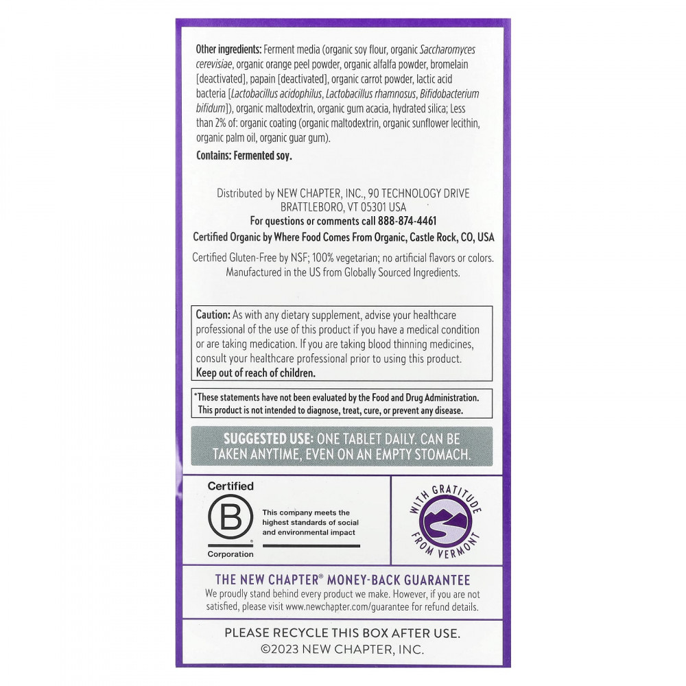 Ферментированная среда (органическая соевая мука, органические пекарские дрожжи (Saccharomyces cerevisiae), органический порошок из цедры апельсина, органический порошок из люцерны, бромелаин [деактивированный], папаин [деактивированный], органический порошок из моркови и молочнокислые бактерии [ацидофильные лактобактерии (Lactobacillus acidophilus), лактобактерии рамнозус [Lactobacillus rhamnosus] и бифидобактерии бифидум [Bifidobacterium bifidum]), органическая оболочка / связывающее вещество (органический мальтодекстрин, органическая аравийская камедь, органический подсолнечный лецитин, органическое пальмовое масло и органическая гуаровая камедь), смесь органической клетчатки (органическая рисовая мука, органическая овсяная клетчатка органический лецитин подсолнечника), диоксид кремния, альгинат натрия, гороховый крахмал и органическая аравийская камедь.