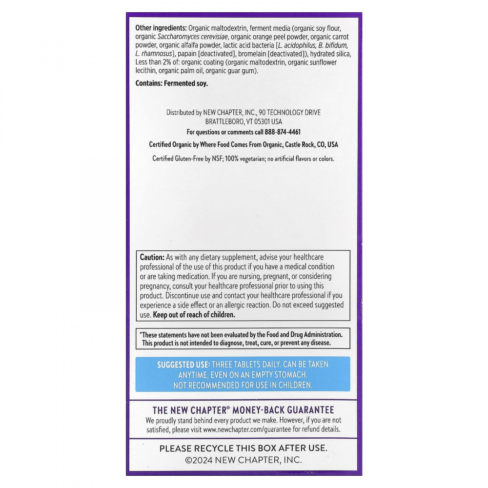 Органический мальтодекстрин, ферментированная среда (органическая соевая мука, органические пекарские дрожжи (Saccharomyces cerevisiae), органический порошок из кожуры апельсина, органический порошок из моркови, органический порошок из люцерны, молочнокислые бактерии - L. ацидофильные, Б. bifidum, л. рамнозус, папаин "деактивированный", бромелаин "деактивированный"), гидратированный диоксид кремния, менее 2% следующих ингредиентов: органическая оболочка (органический мальтодекстрин, органический подсолнечный лецитин, органическое пальмовое масло, органическая гуаровая камедь).