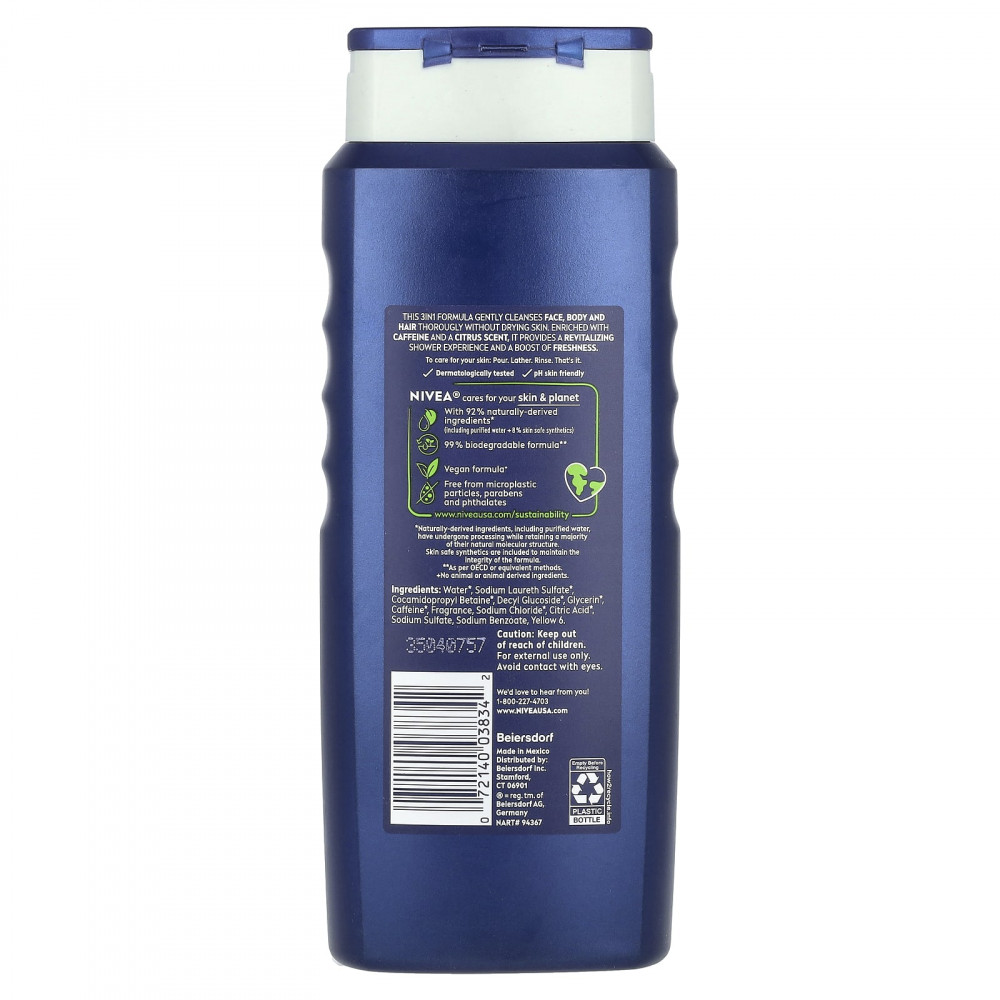 Формула 3в1 нежно очищает лицо, тело и волосы, не сушит кожу. Обогащенный кофеином и цитрусовым ароматом, он обеспечивает бодрящий эффект под душем и придает ощущение свежести.