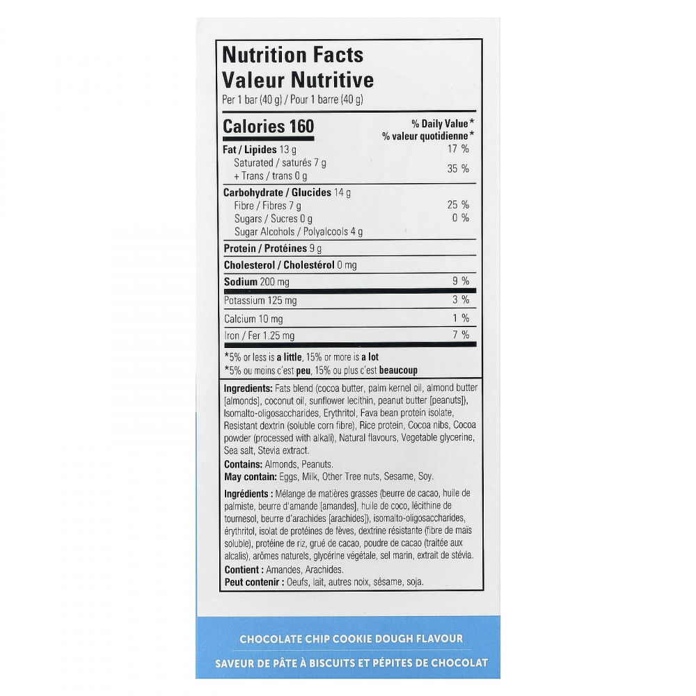 Смесь жиров (какао-масло, пальмоядровое масло, миндальная паста [миндаль], кокосовое масло, подсолнечный лецитин, арахисовая паста [арахис]), Изомальтоолигосахариды, эритритол, изолят белка фасоли фава, устойчивый декстрин (растворимая кукурузная клетчатка), рисовый протеин, какао-бобы, какао-порошок (обработанный щёлочью), натуральные ароматизаторы, растительный глицерин, морская соль, экстракт стевии.