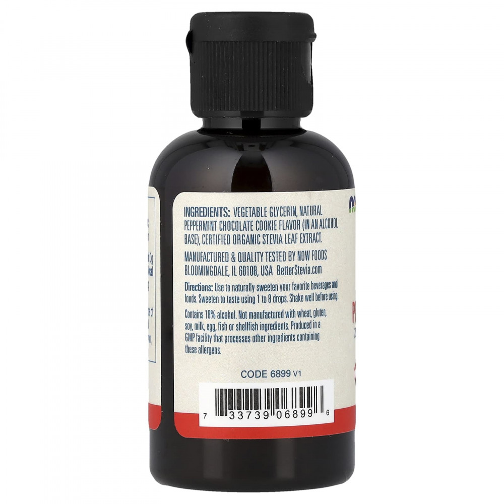 Растительный глицерин, натуральный ароматизатор "Шоколадное печенье с перечной мятой" (на спиртовой основе), сертифицированный органический экстракт листьев стевии.