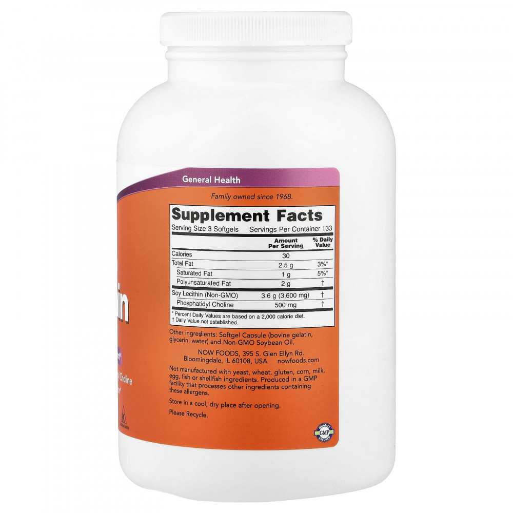 Капсулы с лецитином от NOW® без ГМО содержат фосфатидилхолин, который входит в состав значительной части клеток мозга и нервной системы.Лецитин также содержит незаменимые жирные кислоты природного происхождения и инозитол.Лецитин способствует эмульгированию жиров, позволяя им смешиваться с водой.