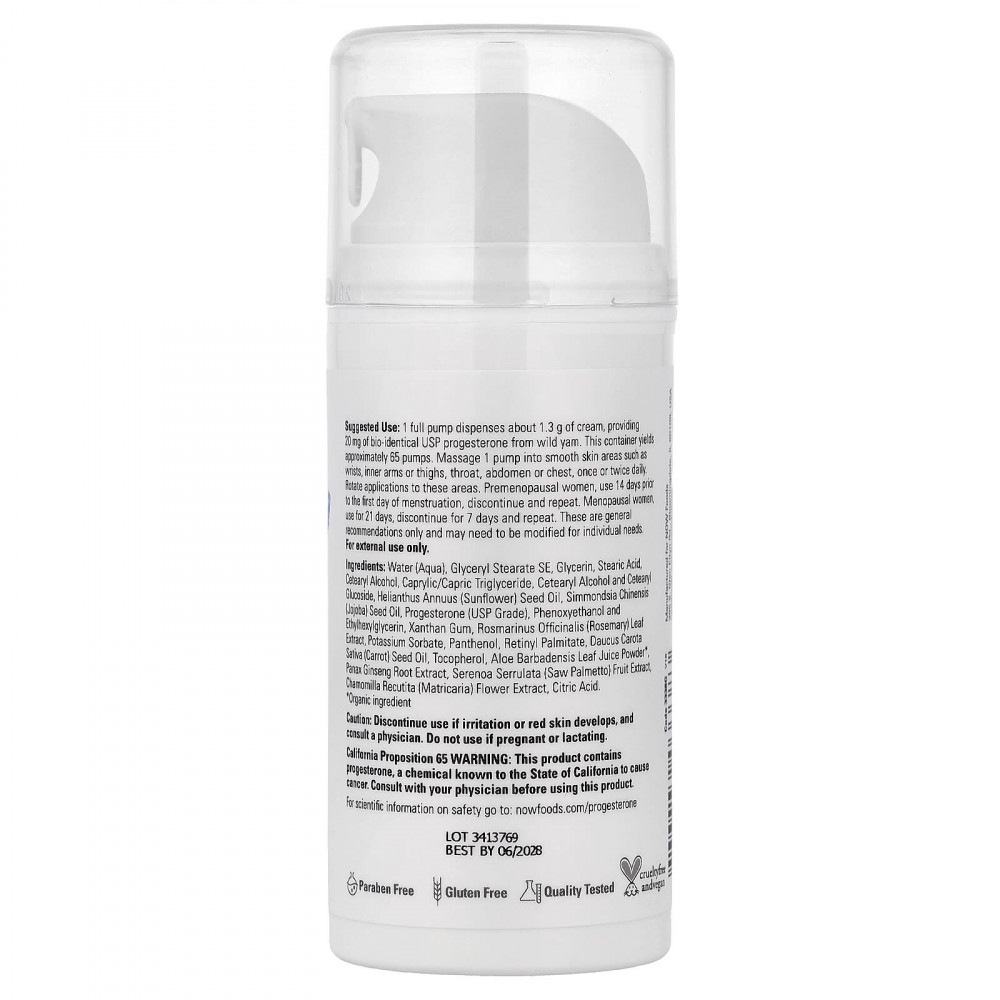 Вода, глицерилстеарат SE, глицерин, стеариновая кислота, Цетеариловый спирт, каприловый/каприновый триглицерид, цетеариловый спирт и цетеариловый глюкозид, Масло семян подсолнечника, Масло семян Simmondsia chinensis (Jojoba), прогестерон (класса USP), феноксиэтанол и этилгексилглицерин, Ксантановая камедь, Экстракт листьев розмарина, сорбат калия, пантенол, ретинилпальмитат, масло из семян моркови (Daucus carota sativa), Токоферол, порошок из сока листьев алоэ вера (Aloe barbadensis)*, экстракт корня женьшеня (Panax ginseng), экстракт плодов серенои (Serenoa serrrulata), Chamomilla recutita (Matricaria) Экстракт цветков, лимонная кислота.