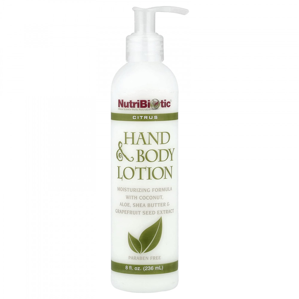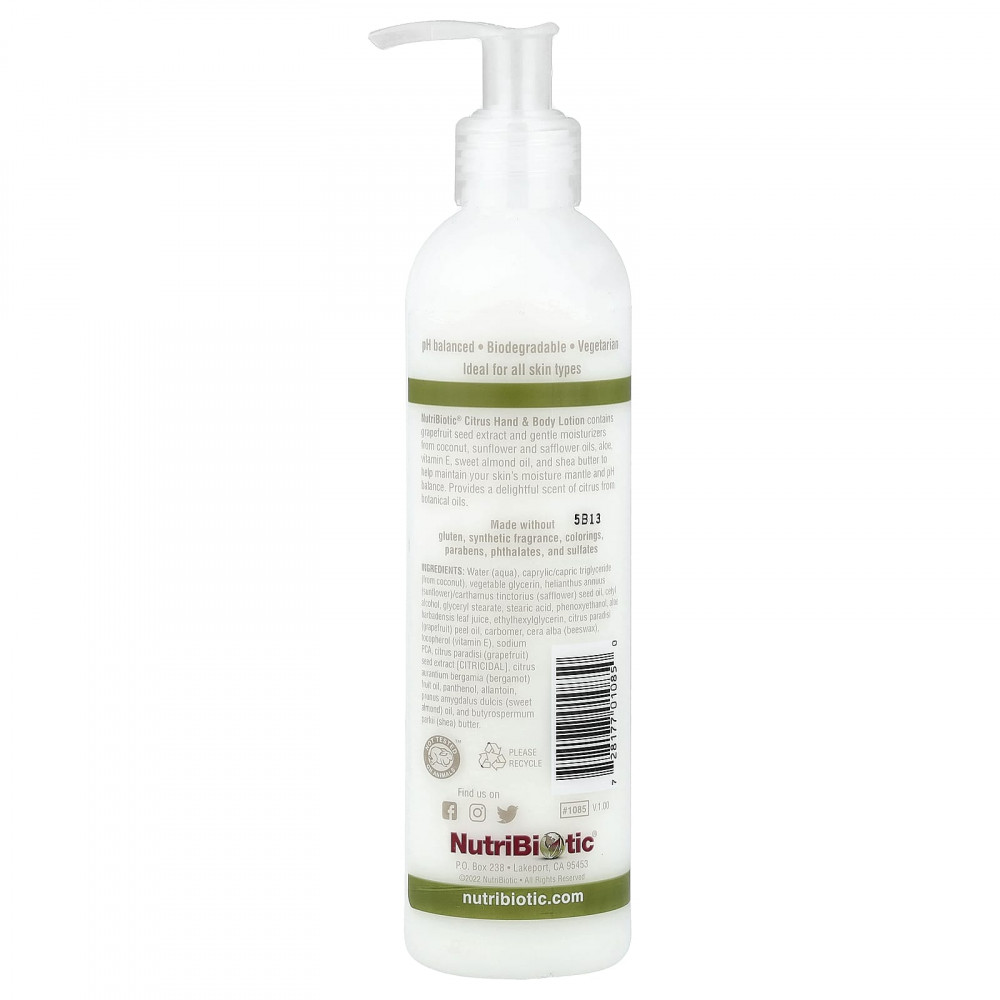 Лосьон для рук и тела с цитрусовыми NutriBiotic® содержит экстракт косточек грейпфрута и мягкие увлажняющие компоненты из масел кокоса, подсолнечника и сафлора, алоэ, витамина Е, масла сладкого миндаля и масла ши, которые помогают поддерживать оптимальный уровень увлажненности кожи и баланс pH. Обеспечивает восхитительный аромат цитрусовых благодаря растительным маслам.