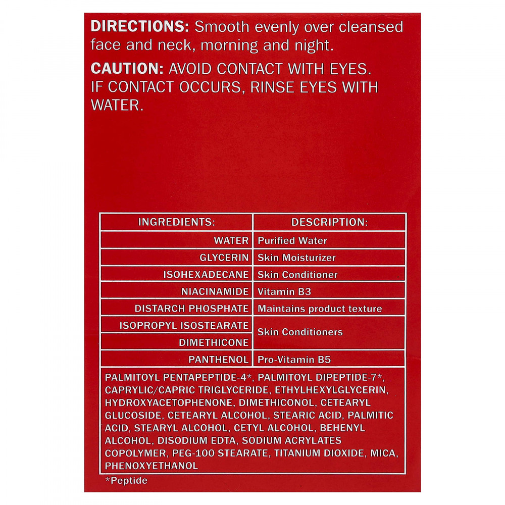 Вода, глицерин, изогексадекан, Ниацинамид, дикрахмалфосфат, изопропил изостеарат, диметикон, пантенол, пальмитоил пентапептид-4*, пальмитоил дипептид-7*, каприловый/каприновый триглицерид, этилгексилглицерин, гидроксиацетофенон, диметиконол, цетеариловый глюкозид, Цетеариловый спирт, стеариновая кислота, пальмитиновая кислота, стеариловый спирт, цетиловый спирт, бегениловый спирт, Динатрия ЭДТА, сополимер акрилатов натрия, ПЭГ-100 стеарат, диоксид титана, слюда, феноксиэтанол.