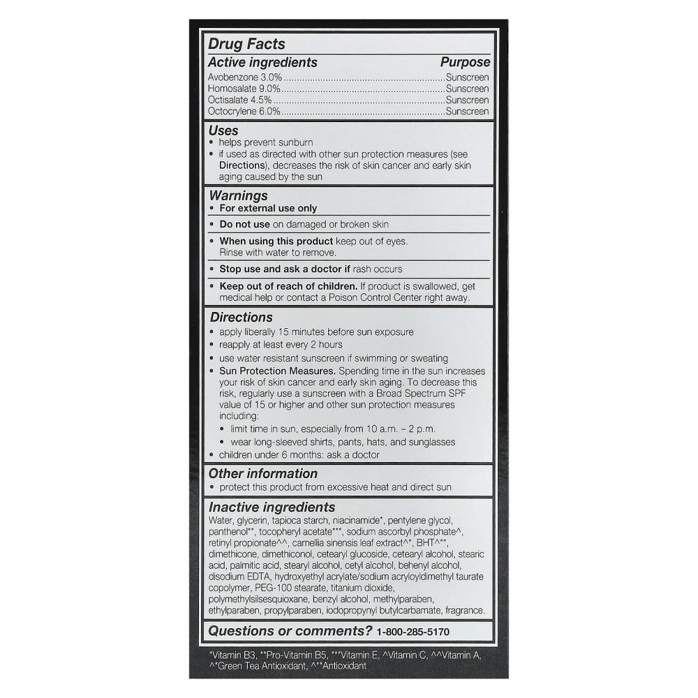 | вода, глицерин, тапиоковый крахмал, никотинамид*, пентилен гликоль, пантенол**, токоферилацетат***, аскорбилфосфат натрия^, ретинил пропионат^^, экстракт листьев зеленого чая (Camellia sinensis)^*, бутилгидрокситолуол^**, диметикон, диметиконол, цетеарил глюкозид, цетеариловый спирт, стеариновая кислота, пальмитиновая кислота, стеариловый спирт, цетиловый спирт, бегениловый спирт, двунатриевая ЭДТК, гидроксиэтилакрилат/натрия акрилоилдиметилтаурата сополимер, ПЭГ-100 стеарат, диоксид титана, полиметилсилсесквиоксан, бензиловый спирт, метилпарабен, этилпарабен, пропилпарабен, йодопропинил бутилкарбамат, отдушка. | |