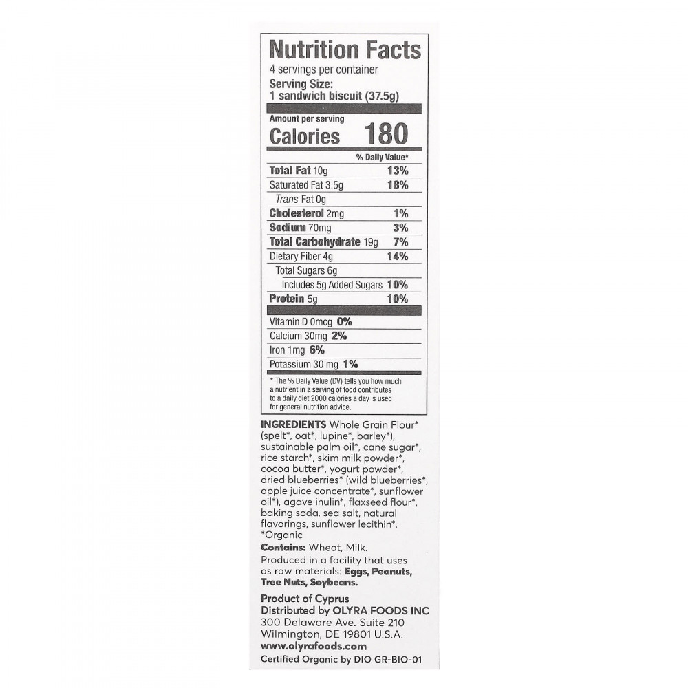 Цельнозерновая мука* (из спельты*, овес*, люпин*, ячмень*), экологически чистое пальмовое масло*, тростниковый сахар*, рисовый крахмал*, порошок из обезжиренного молока*, какао-масло*, порошок из йогурта*, сушеная голубика* (дикорастущая голубика*, концентрат яблочного сока*, подсолнечное масло*), инулин из агавы*, льняная мука*, пищевая сода, морская соль, натуральные ароматизаторы, подсолнечный лецитин*.
