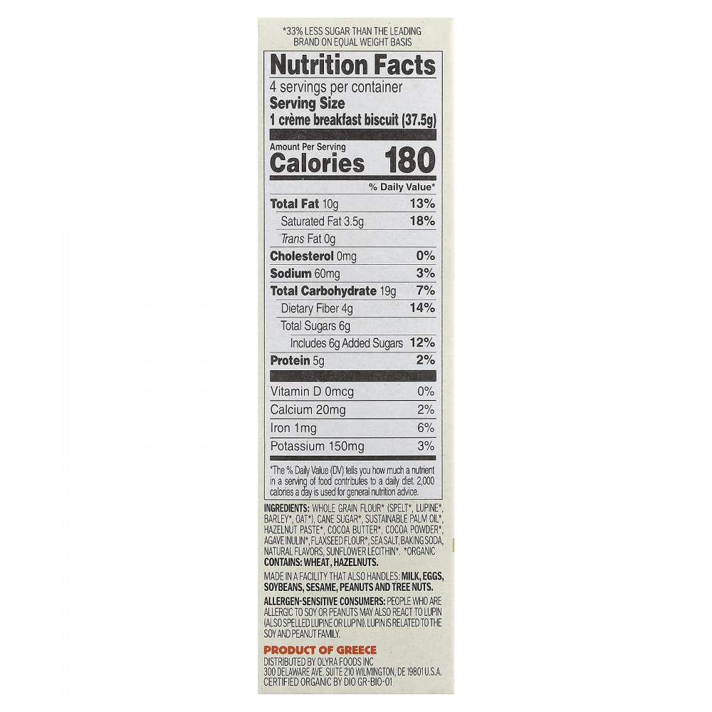 Цельнозерновая мука* (из спельты*, люпин*, ячмень*, овес*), тростниковый сахар*, экологически чистое пальмовое масло*, паста из фундука*, какао-масло*, какао-порошок*, инулин из агавы*, льняная мука*, морская соль, пищевая сода, натуральные ароматизаторы, подсолнечный лецитин*.