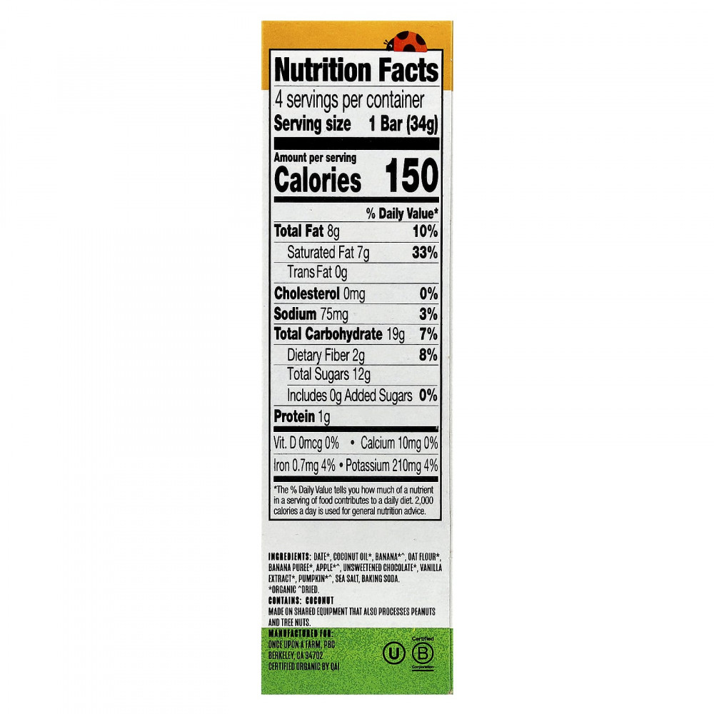 Дата *, кокосовое масло*, банан * ^, овсяная мука * банановое пюре *, яблоко * ^, несладкий шоколад *, экстракт ванили *, тыква * ^, морская соль, пищевая сода.