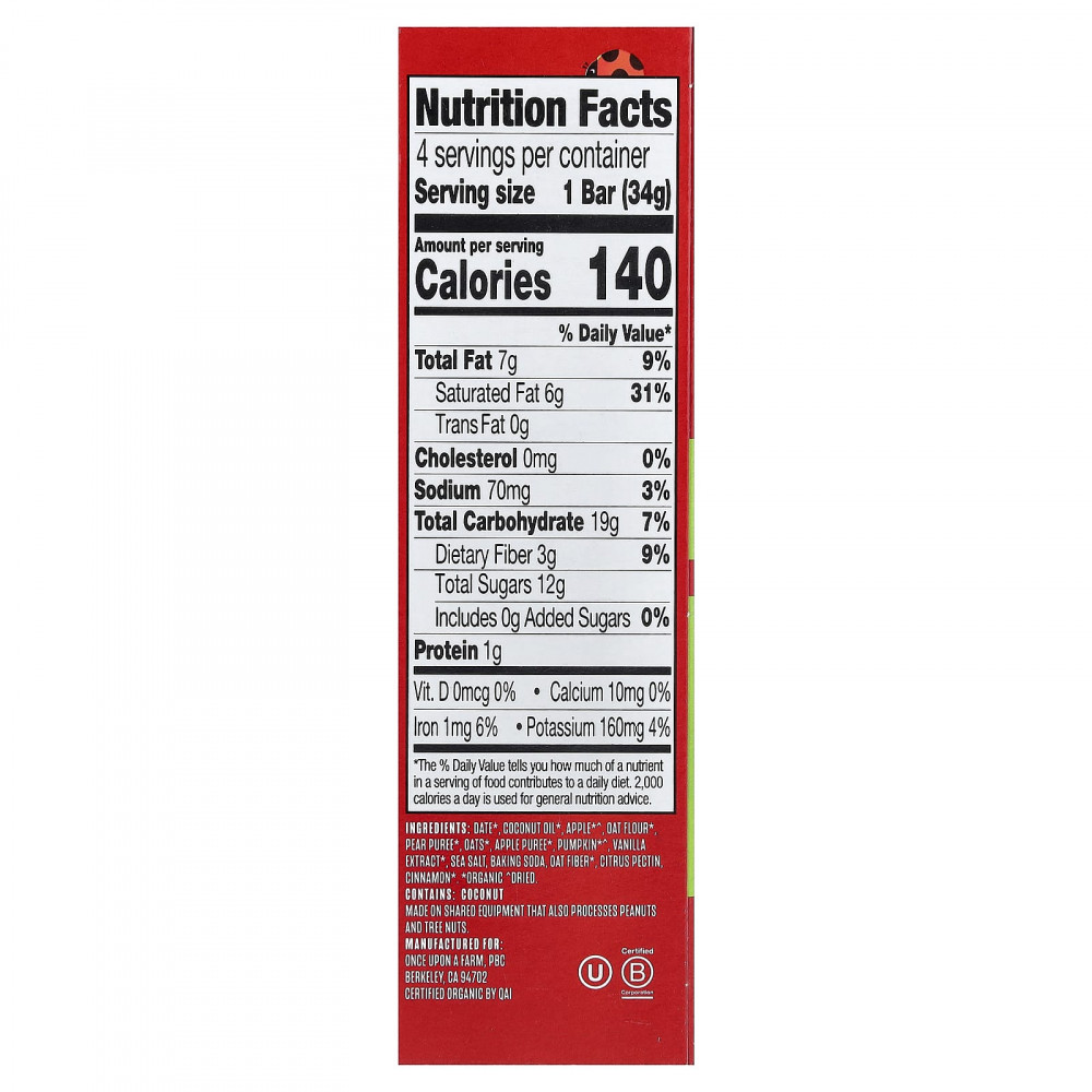 Дата*, кокосовое масло*, яблоко*^, овсяная мука*, грушевое пюре*, овес*, яблочное пюре*, тыква*^, экстракт ванили*, морская соль, Пищевая сода, овсяная клетчатка*, цитрусовый пектин, корица*