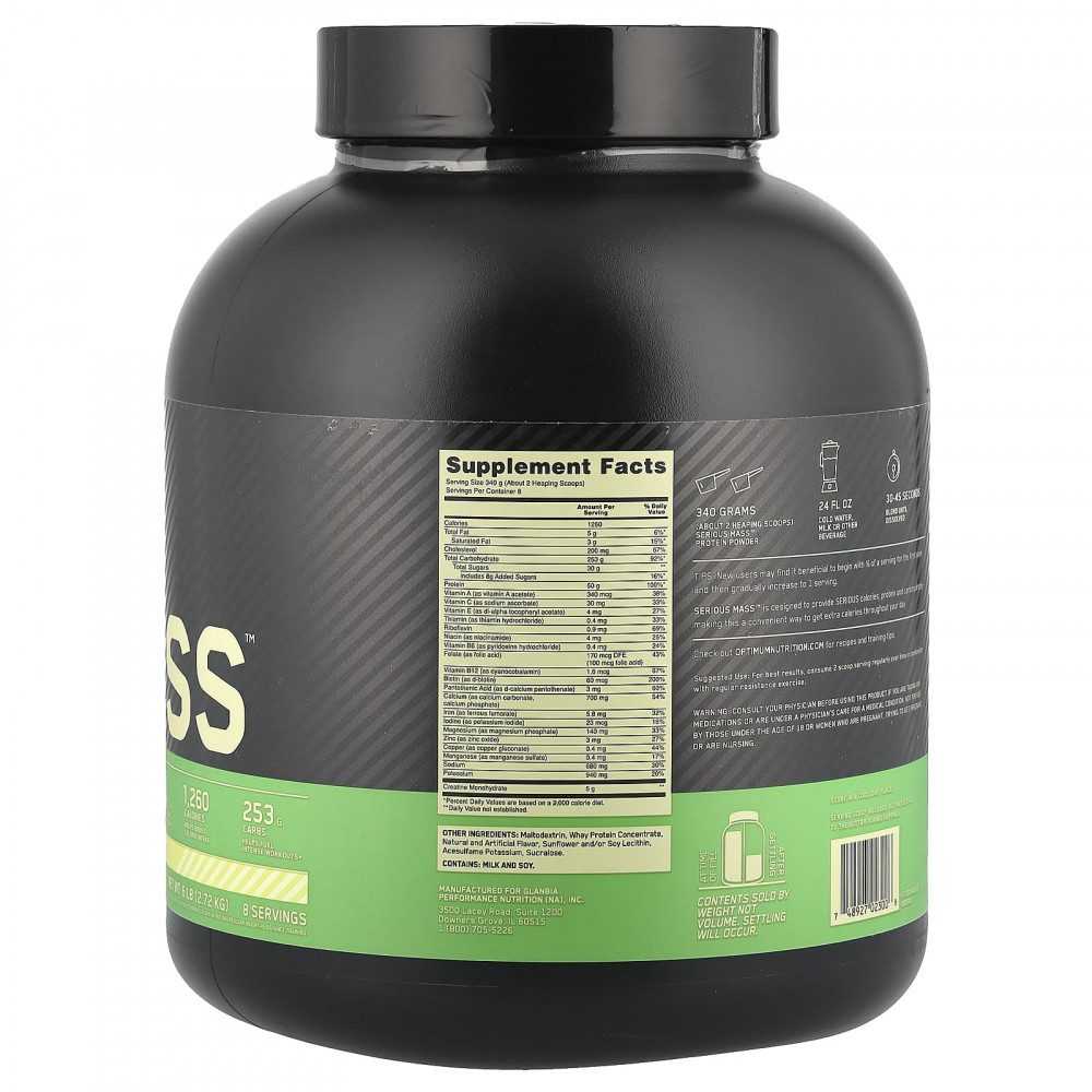 Serious Mass™ разработан для того, чтобы удобным способом получать дополнительные калории в течение дня. Поэтому он содержит значительное количество калорий, белков и углеводов.