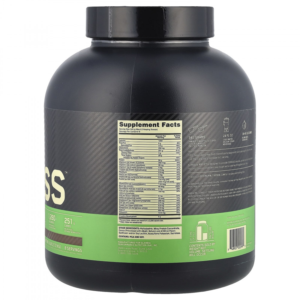Добавка SERIOUS MASS разработана для того, чтобы удобным способом получать дополнительные калории в течение дня. Поэтому она содержит значительное количество калорий, белков и углеводов.