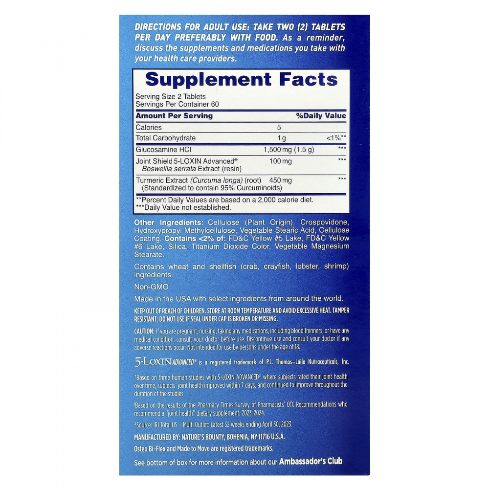 Osteo Bi-Flex® Triple Strength + куркума содержит глюкозамин, который помогает укрепить суставы, поддерживая суставной хрящ, необходимый для комфортного движения в суставах. Куркума веками использовалась в традиционной медицине. Куркумин в куркуме - это то, что придает ей антиоксидантные свойства. Куркума в нашем продукте специально разработана для стандартизации до 95% куркуминоидов, чтобы обеспечить наиболее оптимальный уровень куркумина.
