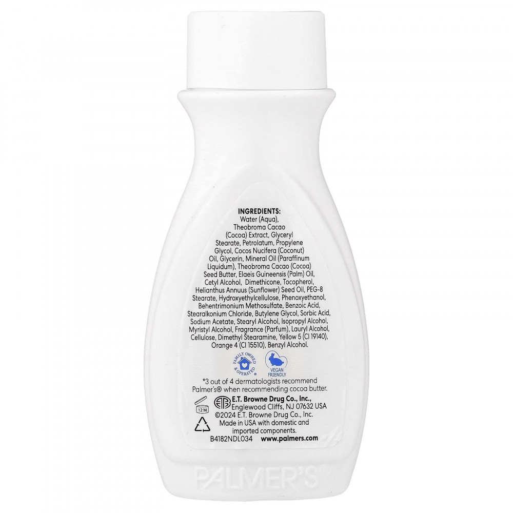 Лосьон для ежедневного использования Palmer's® Cocoa Butter Formula® заживляет и смягчает огрубевшую и сухую кожу, содержит интенсивно увлажняющее какао-масло и витамин E.