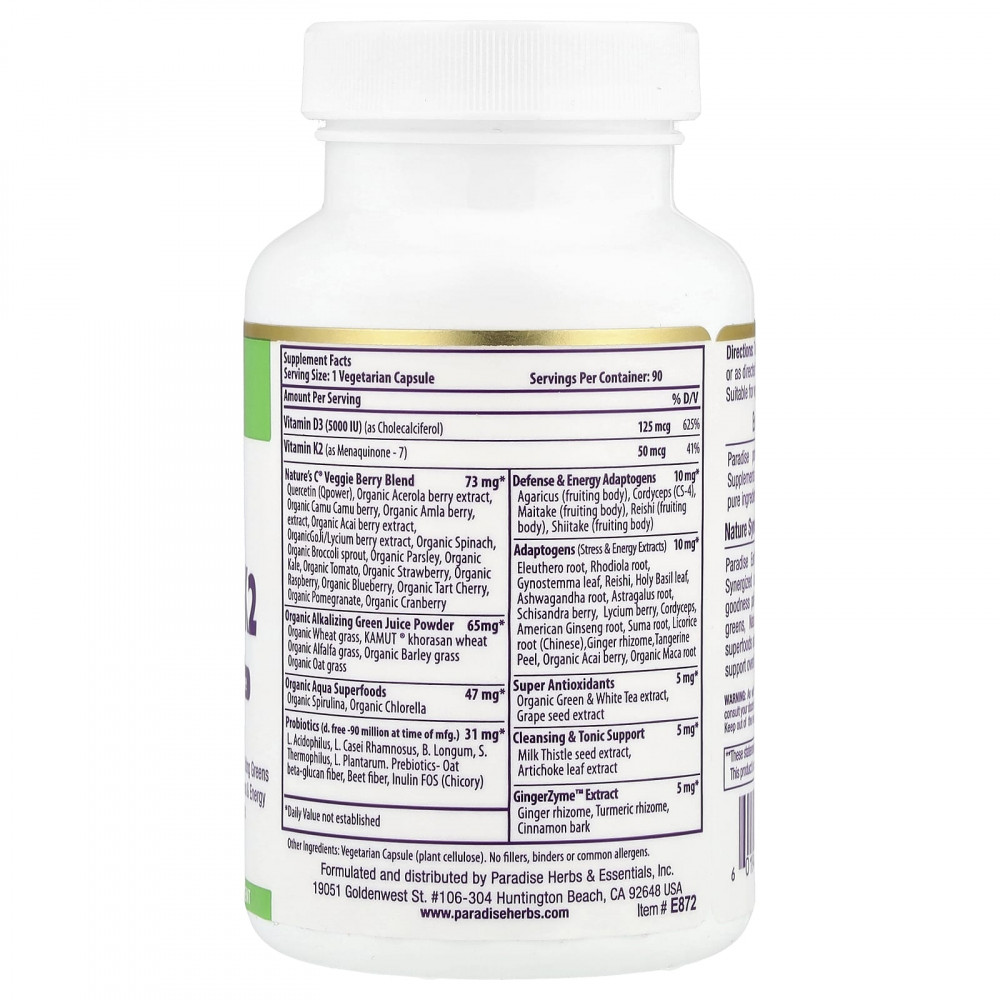 Смесь витаминов D3 + K2 от Paradise Earth - это действительно суперфуд, синтезированный природой. В нашей формуле используются настоящие цельные продукты питания в сочетании с витамином D3, пробиотиками и адаптагенами для повышения настроения, которые преодолевают простой дефицит и помогают поддерживать общее здоровье системы. Витамин D обычно вырабатывается в коже организма под воздействием солнечного света, поэтому он известен как солнечный витамин. Витамин D поддерживает многие важные функции, способствующие укреплению здоровья.