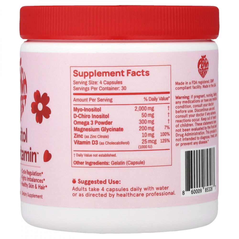 Мультивитамины инозитола от Peach Perfect — ваш верный друг в путешествии к регулярному циклу, более здоровой коже и волосам, а также повышению уровня энергии.