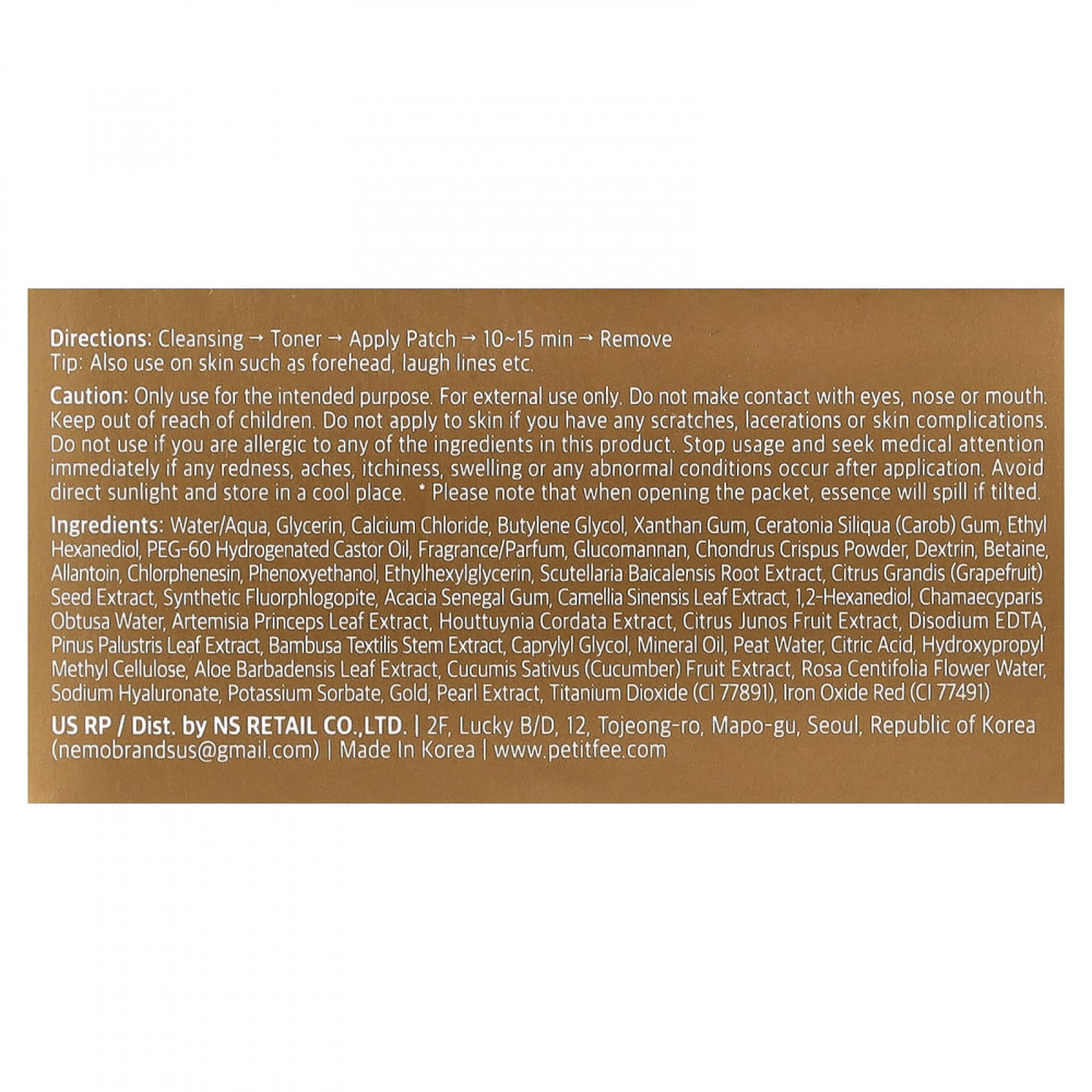 Гидрогелевые патчи, пропитанные эссенцией, содержащей чёрный жемчуг и порошок из чистого золота, бетаин, розовую воду и кипарисовую воду, улучшают кровообращение и омолаживают тусклую кожу, помогают скрыть мешки под глазами и делают кожу сияющей и здоровой на вид.