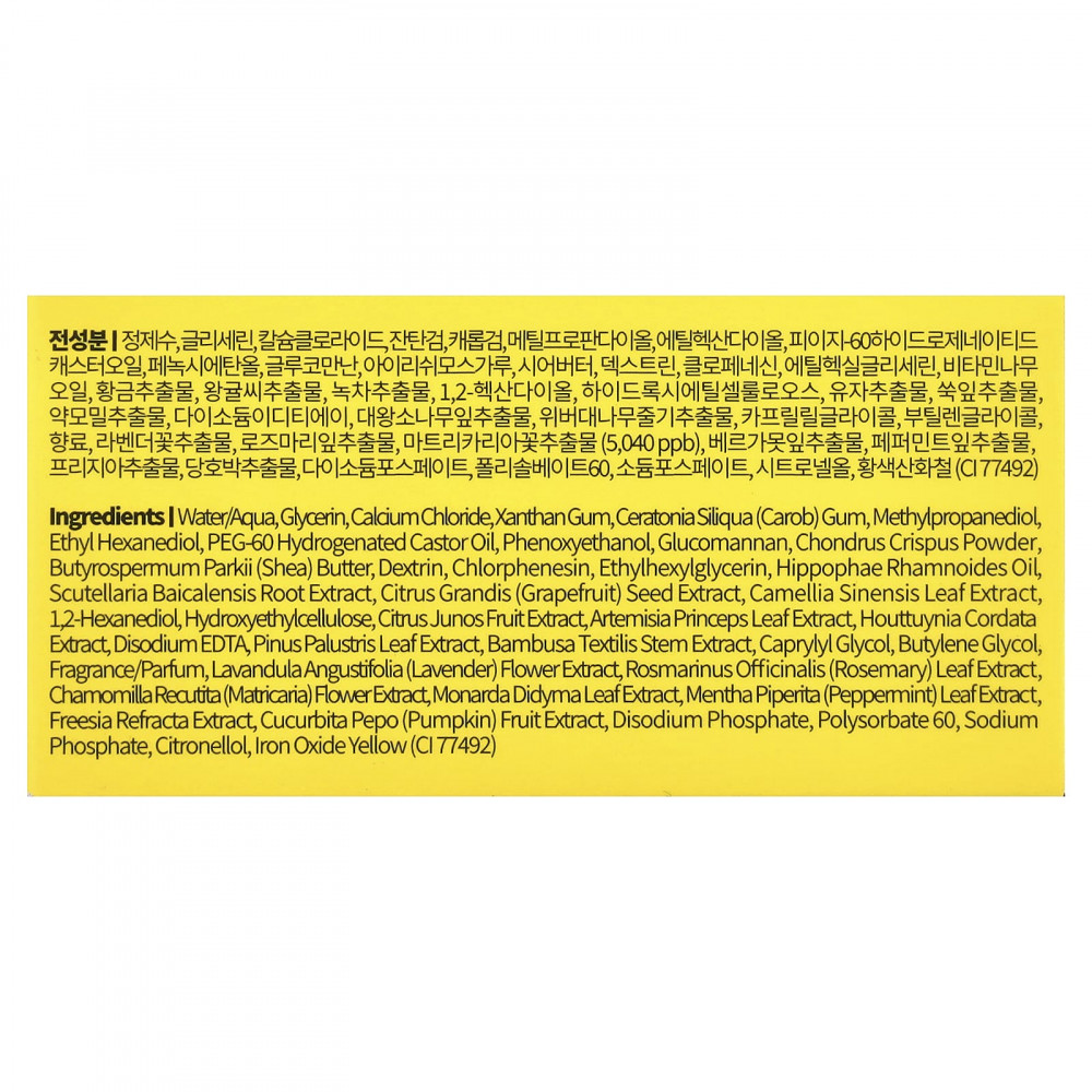 Вода (Aqua), глицерин, хлорид кальция, ксантановая камедь, камедь рожкового дерева (Ceratonia siliqua), метилпропандиол, этил гександиол, ПЭГ-60 гидрогенизированное касторовое масло, феноксиэтанол, глюкоманнан, порошок из ирландского мха (Chondrus crispus), масло ши (Butyrospermum parkii), декстрин, хлорфенезин, этилгексилглицерин, масло облепихи крушиновидной (Hippophae rhamnoides), экстракт корня шлемника (Scutellaria baicalensis), экстракт семян грейпфрута (Citrus grandis), экстракт листьев зелёного чая (Camellia sinensis), 1,2-гександиол, гидроксиэтилцеллюлоза, экстракт плодов юдзу (Citrus junos), экстракт листьев полыни корейской (Artemisia princeps), экстракт хауттюйнии (Houttuynia cordata), двунатриевая ЭДТК, экстракт хвои сосны болотной (Pinus palustris), экстракт стеблей бамбука (Bambusa textilis), каприлилгликоль, бутиленгликоль, отдушка (парфюмерная композиция), экстракт цветков лаванды (Lavandula angustifolia), экстракт листьев розмарина (Rosmarinus officinalis), экстракт цветков ромашки лекарственной (Chamomilla recutita), экстракт листьев монарды двойчатой (Monarda didyma), экстракт листьев перечной мяты (Mentha piperita), экстракт фрезии (Feesia refracta), экстракт плодов тыквы (Cucurbita pepo), динатрия фосфат, полисорбат 60, фосфат натрия, цитронеллола, оксид железа желтый (CI 77492).