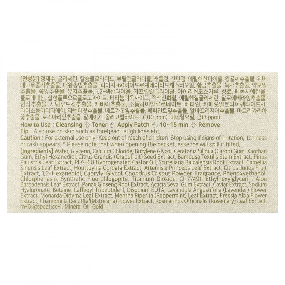 Вода, глицерин, хлорид кальция, бутиленгликоль, камедь рожкового дерева (Ceratonia siliqua), ксантановая камедь, этил гександиол, экстракт семян грейпфрута (Citrus grandis), экстракт стеблей бамбука (Bambusa arundinacea), экстракт хвои сосны болотной (Pinus palustris), ПЭГ-60 гидрогенизированное касторовое масло, экстракт корня шлемника байкальского (Scutellaria baicalensis), экстракт листьев зеленого чая (Camellia sinensis), экстракт хауттюйнии сердцевидной (Houttuynia cordata), экстракт листьев полыни корейской (Artemisia princeps), экстракт плодов юдзу (Citrus junos), 1,2-гександиол, каприлилгликоль, порошок из ирландского мха (Chondrus crispus), отдушка, феноксиэтанол, хлорфенезин, синтетический фторфлогопит, диоксид титана, CI 77491, этилгексилглицерин, экстракт листьев алоэ вера (Aloe barbadensis), экстракт корня женьшеня (Panax ginseng), экстракт камеди акации сеяльской (Acacia seyal), экстракт черной икры, гиалуронат натрия, бетаин, кофеоил трипептид-1, двунатриевая ЭДТК, экстракт цветков лаванды (Lavandula angustifolia), экстракт листьев монарды двойчатой (Monarda didyma), экстракт листьев перечной мяты (Mentha piperita), экстракт цветков фрезии (Freesia alba), экстракт цветков ромашки лекарственной (Chamomilla recutita), экстракт листьев розмарина (Rosmarinus officinalis), rh-олигопептид-1, минерального масла, золото.