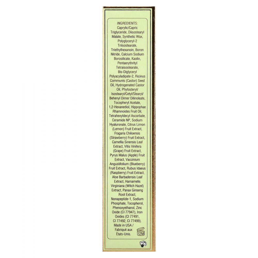 Каприловый/каприновый триглицерид, диизостеарил малат, синтетический воск, полиглицерил-2 триизостеарат, триэтилгексаноин, нитрид бора, кальций натрий боросиликат, каолин, пентаэритритил тетраизостеарат, бис-диглицерил полиациладипат-2, касторовое масло (Ricinus communis), гидрогенизированное касторовое масло, фитостерил/изостеарил/цетил/стеарил/бегенил димер дилинолеат, токоферилацетат, 1,2-гександиол, масло из плодов облепихи крушиновидной (Hippophae rhamnoides), тетрагексилдецил аскорбат, керамид NP, гиалуронат натрия, экстракт плодов лимона (Citrus limon), экстракт ягод клубники (Fragaria chiloensis), экстракт листьев зелёного чая (Camellia sinensis), экстракт плодов винограда (Vitis vinifera), экстракт яблока (Pyrus malus), экстракт ягод голубики (Vaccinium angustifolium), экстракт ягод малины (Rubus idaeus), экстракт листьев алоэ вера (Aloe barbadensis), экстракт гамамелиса (Hamamelis virginiana), экстракт корня женьшеня (Panax ginseng), нонапептид-1, фосфат натрия, токоферол, феноксиэтанол, оксид цинка (CI 77947), оксиды железа (CI 77491, CI 77492, CI 77499).
