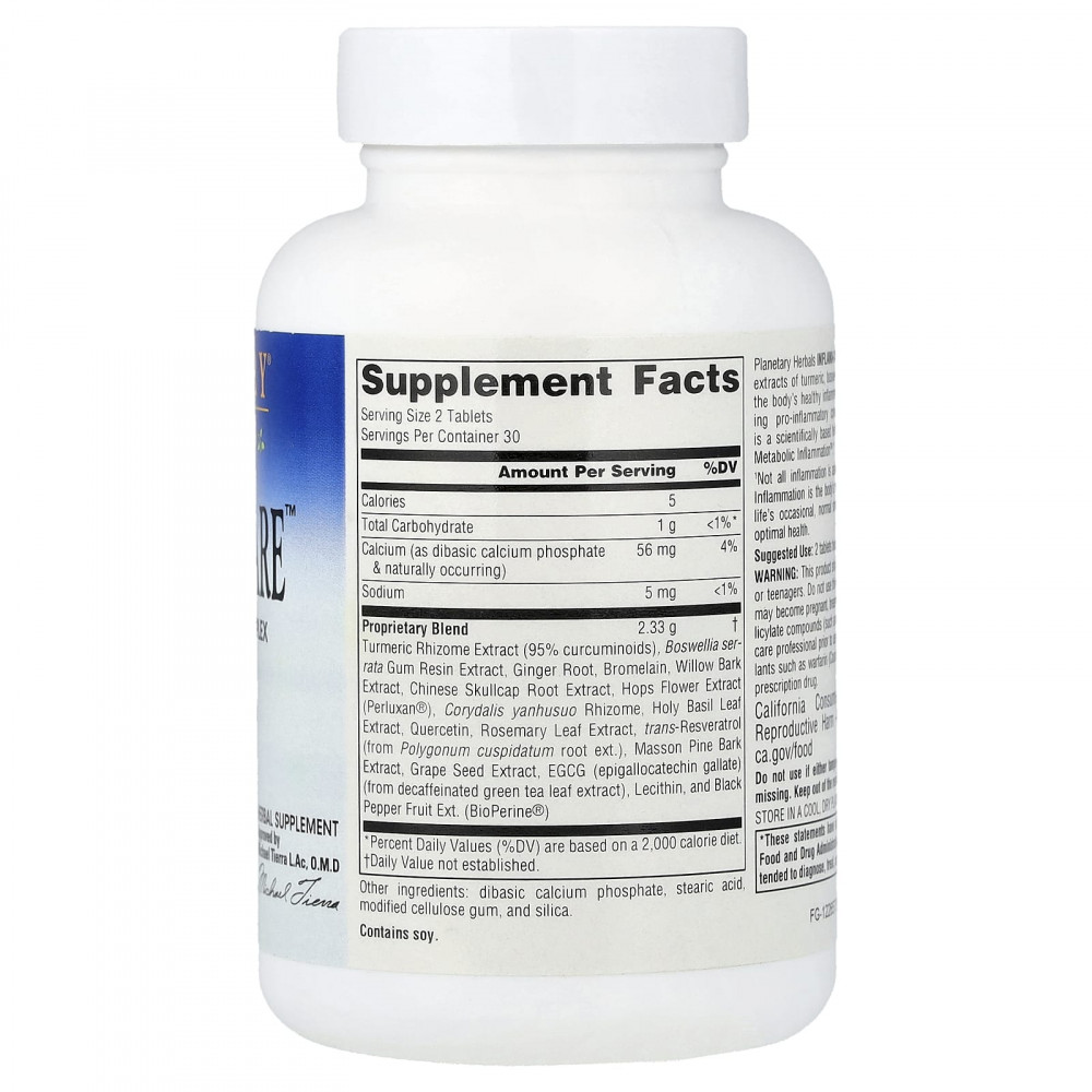 Planetary Herbals INFLAMA-CARE ™ содержит концентрированные экстракты куркумы, босвеллии и имбиря, которые поддерживают здоровую воспалительную реакцию организма, модулируя провоспалительные соединения. INFLAMA-CARE ™ - это научно обоснованный травяной ответ на огонь метаболического воспаления ™.