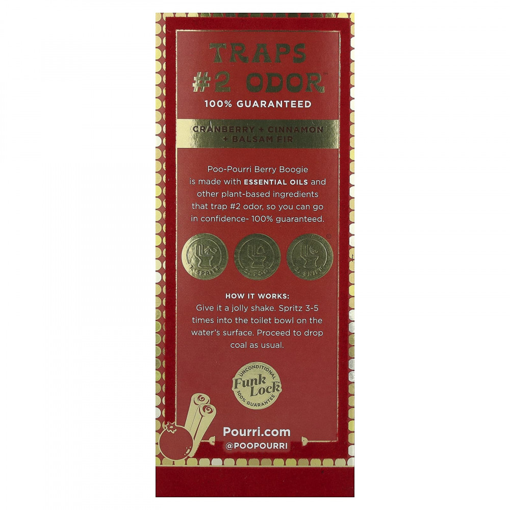 Средство Poo-Pourri Berry Boogie изготовлено из эфирных масел и других растительных ингредиентов, которые улавливают запах № 2, поэтому вы можете быть уверены в своем выборе — гарантировано 100%.