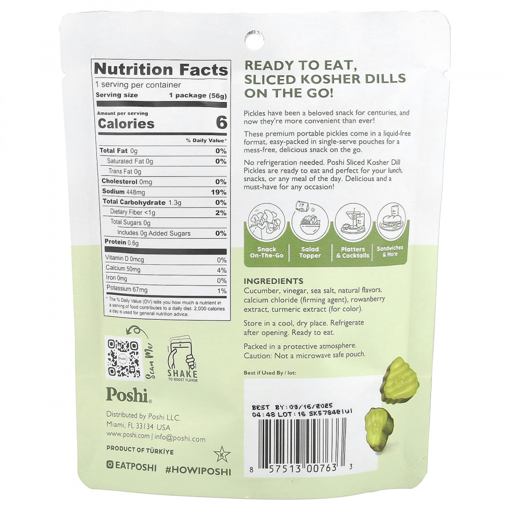 Не требует хранения в холодильнике. Кошерные соленья с укропом, нарезанные поши, можно употреблять в пищу. Они идеально подходят для обеда, перекуса или любого приема пищи в течение дня. Вкусный и незаменимый продукт на любой случай!