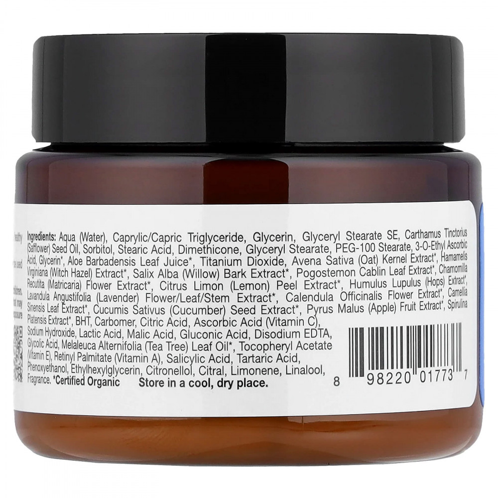 Вода (Aqua), каприловый/каприновый триглицерид, глицерин, глицерил стеарат эмульгирующий, масло из семян сафлора (Carthamus tinctorius), сорбитол, стеариновая кислота, диметикон, глицерил стеарат, ПЭГ-100 стеарат, 3-O-этил-аскорбиновая кислота, глицерин*, сок листьев алоэ вера (Aloe barbadensis)*, диоксид титана, экстракт ядер овса (Avena sativa)*, экстракт гамамелиса (Hamamelis virginiana)*, экстракт коры ивы (Salix alba)*, экстракт листьев пачули (Pogostemon cablin)*, экстракт цветков ромашки (Chamomilla recutita)*, экстракт кожуры лимона (Citrus limon)*, экстракт хмеля (Humulus lupulus)', экстракт цветков, листьев и стеблей лаванды (Lavandula angustifolia)*, экстракт цветков календулы (Calendula officinalis)*, экстракт листьев зеленого чая (Camellia sinensis)*, экстракт семян огурца (Cucumis sativus)*, экстракт плодов яблока (Pyrus malus)*, экстракт спирулины (Spirulina platensis)*, бутилгидрокситолуол, карбомер, лимонная кислота, аскорбиновая кислота (витамин C), гидроксид натрия, молочная кислота, яблочная кислота, глюконовая кислота, двунатриевая ЭДТК, гликолевая кислота, масло из листьев чайного дерева (Melaleuca alternifolia)*, токоферилацетат (витамин E), ретинилпальмитат (витамин A), Салициловая кислота, винная кислота, феноксиэтанол, этилгексилглицерин, цитронеллол, цитраль, лимонен, линалоол, отдушка.