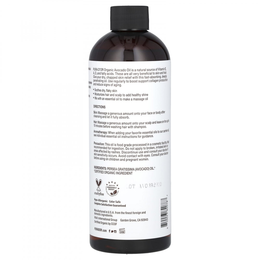 Органическое масло авокадо PURA D'OR — натуральный источник витаминов E, A, D и жирных кислот. Все это очень полезно для кожи и волос. Это быстро впитывающееся, глубоко проникающее масло облегчит состояние сухой, потрескавшейся кожи. Регулярно принимайте для поддержки выработки коллагена и уменьшения признаков старения.