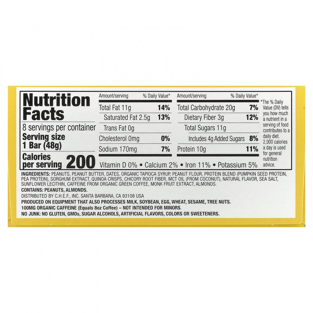 Арахис, Арахисовая паста, финики, органический тапиоковый сироп, арахисовая мука, смесь протеинов (протеин из семян тыквы, гороховый протеин), экстракт сорго, чипсы из киноа, клетчатка из корня цикория, масло MCT (из кокоса), натуральный ароматизатор, морская соль, подсолнечный лецитин, кофеин из органического зеленого кофе, экстракт архата, миндаль.