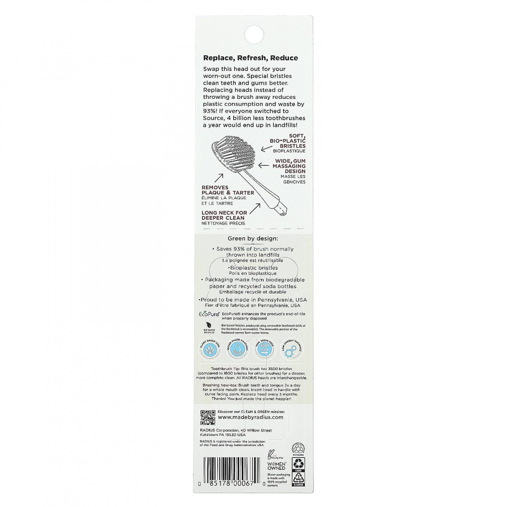 Головка зубной щетки. Эта щетка имеет 3500 щетинок (по сравнению с 1800 щетинками у других щеток) для более глубокой и полной очистки. Все головки RADIUS взаимозаменяемы.