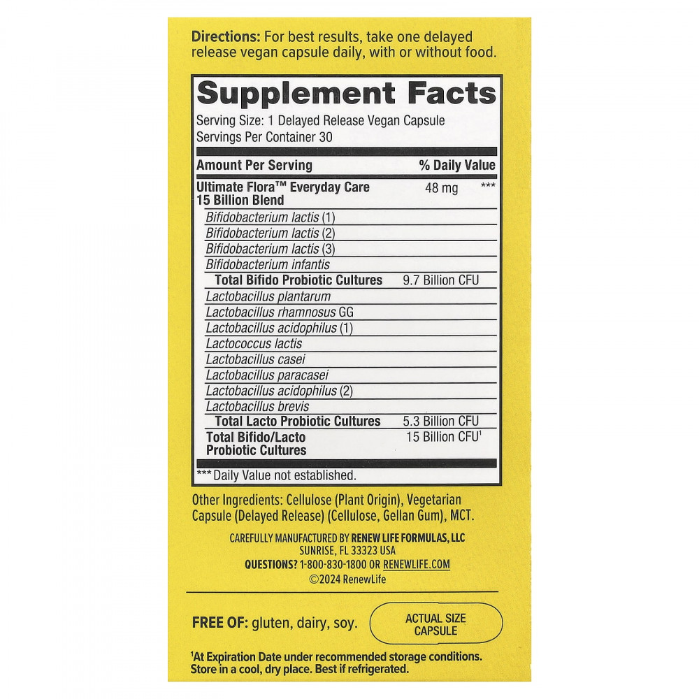 Капсула с отсроченным высвобождением. Желудочная кислота может разрушить пробиотики. Капсулы с отсроченным высвобождением от Ultimate Flora™ обеспечивают попадание в кишечник более безопасных пробиотиков.