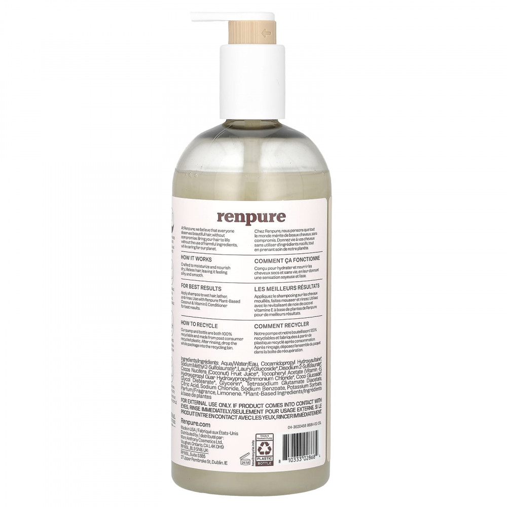Нанесите шампунь на влажные волосы, вспеньте и смойте. Для достижения наилучших результатов используйте вместе с кондиционером Renpure с кокосом и витамином E.