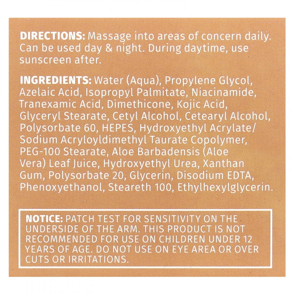 Вода, пропиленгликоль, азелаиновая кислота, изопропилпальмитат, никотинамид, транексамовая кислота, диметикон, койевая кислота, глицерил стеарат, цетиловый спирт, цетеариловый спирт, полисорбат 60, hepes, гидроксиэтил акрилат/натрия акрилоилдиметилтаурата сополимер, ПЭГ-100 стеарат, сок листьев алоэ вера (Aloe barbadensis), гидроксиэтилированная мочевина, ксантановая камедь, полисорбат 20, глицерин, двунатриевая ЭДТК, феноксиэтанол, стеарет 100, этилгексилглицерин.