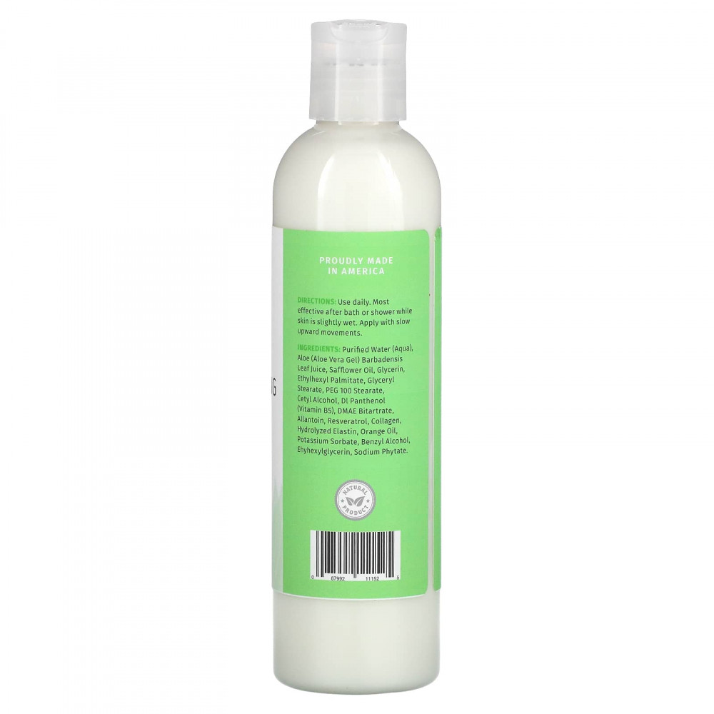 Очищенная вода, сок листьев алоэ вера (Aloe vera) barbadensis, сафлоровое масло, глицерин, этилгексил пальмитат, глицерил стеарат, ПЭГ 100 стеарат, цетиловый спирт, дл пантенола (витамина B5), битартрат ДМАЭ, аллантоин, ресвератрол, коллаген, гидролизованный эластин, апельсиновое масло, сорбат калия, бензиловый спирт, эгигексилглицерин, фитат натрия.