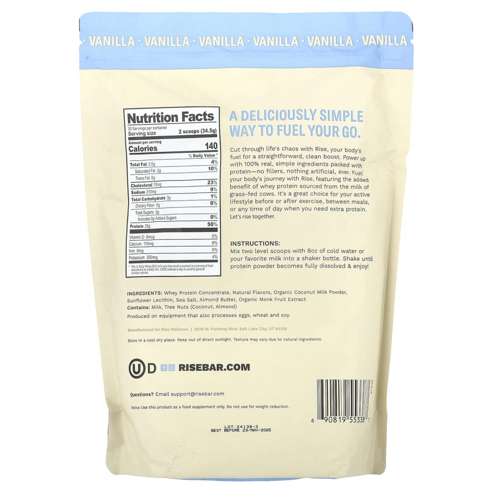 Избавьтесь от жизненного хаоса с Rise, топливом для вашего тела и чистым зарядом энергии. Используйте на 100% настоящие простые ингредиенты без протеина и наполнителей. Наполните организм энергией с помощью добавки Rise, в которой содержится сывороточный протеин, полученный из молока коров, получавших травяное вскармливание. Это отличный выбор для активного образа жизни до или после тренировки, между приемами пищи или в любое время дня, когда вам нужен дополнительный белок. Встанем вместе.